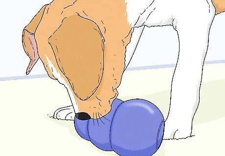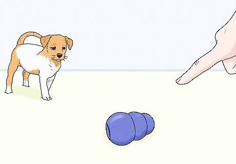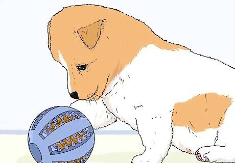 Entertain your puppy with a puzzle toy. Dogs are super smart, and their brains need entertainment too. Purchase a puzzle toy that you can fill with treats or kibble to give your puppy a game to play for their reward. These toys will require your puppy to play with them in order to get the reward, so they’ll have a lot of fun while exercising their mind. You can buy puzzle toys in the shape of a ball or a small maze at most pet supply stores.