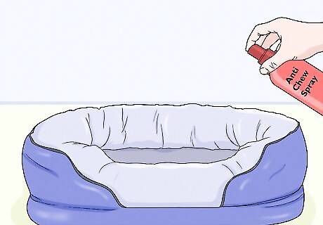 Spray anti chew spray on your puppy’s bed. Anti chew spray smells and tastes pretty bad, so it may stop your dog from biting or chewing their bed. Spray a thin coat of the spray on your dog’s bed to deter them from chewing on it when they feel the urge. You can find anti chew spray at most pet supply stores. While anti chew spray is a good deterrent, it won’t stop your puppy from chewing their bed all on its own. Use the spray in conjunction with the other methods for the best results.