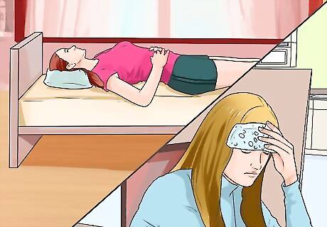 Treat the symptoms of exercise headaches. Some common migraine treatment methods may be effective in alleviating pain caused by exercise headaches. Try a hot or cold compress. Applying a hot or cold compress to the head or neck effectively treats migraines in some individuals. Lie down in a dark, quiet room. Some people find massages and small quantities of caffeine helpful in alleviating migraines.
