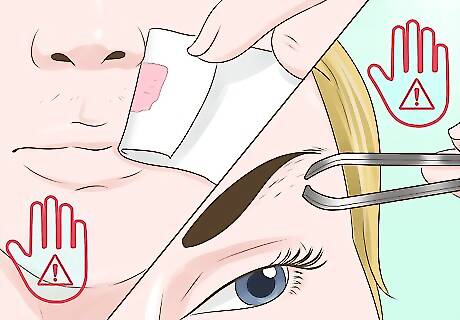 Limit plucking and facial waxing. Whenever you pull hairs from a follicle, you create an opening that is susceptible to infection. If you have your eyebrows plucked or any facial hair waxed, such as around your mouth and chin, you might see some breakouts. To avoid this, limit how often you pluck or wax any facial hairs. Shaving can have a similar effect, especially if you use a dull razor that pulls the hairs from the follicle instead of cutting them. Try sugaring or threading as alternatives to plucking or waxing.