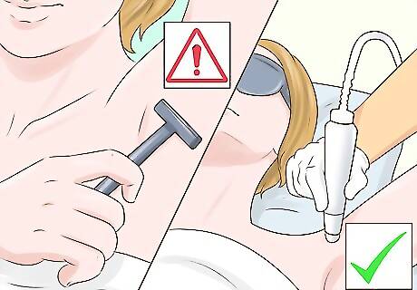 Remove body hair gently. Because it leaves pores and follicles susceptible to bacteria, removing body hair, by either shaving or waxing, can lead to breakouts. Instead, you might want to consider laser hair removal, which is less irritating to the skin. If you do have to shave, make sure that you use a shaving cream designed for sensitive skin. This is particularly important if you get acne around your bikini line. You can also try gentler alternatives, like sugaring and threading.
