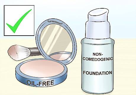 Try different makeups. Although makeup can be great for hiding acne, it can also cause breakouts. Over applying makeups or using particularly oily products can clog your pores and lead to infections. If you are getting breakouts on certain parts of your face, try a different product and see if it clears up. It may take a couple of weeks for your body to get used to the new products, so don't switch again if you don't see any results right away. In general, try to use products that are oil-free or noncomedogenic. You should also look for makeups that contain acne-fighting ingredients. Always remove your makeup before you go to bed. If your skin is particularly oily, you may need to use a special makeup remover instead of simply washing your face.