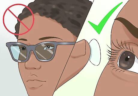 Wear contacts instead of glasses. If you tend to get breakouts around your nose, your glasses may be the culprit. Your glasses house bacteria that can cause infections. In addition, they rub and put pressure on your skin, which can irritate it and stimulate oil production. If your glasses are causing you acne, consider using a spot treatment or ditching your glasses entirely and wear contacts. Be sure to regularly clean the nose pads of your glasses by washing them with hot soapy water. This remove any bacteria that might cause a breakout.