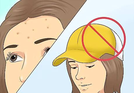 Limit what touches your skin. If you repeatedly get acne on specific parts of your body, think about what touches that area regularly. You may find that your hands or an article of clothing may be touching that area and causing breakouts. To prevent this, avoid touching your face with dirty hands or wearing tight fitting or dirty clothes. For example, if you wear a baseball cap and regularly get acne on your forehead, try not wearing the hat and see if the acne clears up. Acne can also appear in places that are regularly in contact with your hair (for example, on the forehead, under your bangs). This can be a particular problem if you use oily hair care products. Try keeping your hair off of the affected area, and stick to hair products that are oil-free.