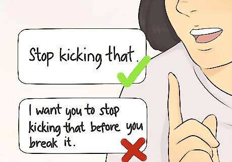 Use short phrases when speaking to an upset toddler. It is easier for a child to hear and comprehend 2 or 3 words spoken at a time than an entire sentence. A simple command such as “Stop kicking that” will be better understood than a sentence like “I want you to stop kicking that before you break it.” If your child understands what you expect from them, they are less likely to start or continue a temper tantrum out of frustration. Sometimes a child will respond better if you tell them what you want them to do, instead of reprimanding them by telling them not to do something. An example would be to tell a child to "Walk, please" instead of saying "Don't run.”