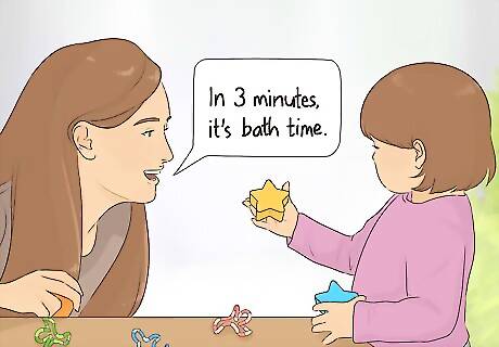 Transition between tasks to make interruptions or changes less jarring. If the child becomes agitated when you stop an activity for bath time or dinner, they may be more prone to outbursts. Understanding this can help you develop a more effective way to transition from one activity to another, which can help prevent tantrums. Announce the upcoming change more than once: “In 5 minutes, it will be time for your bath,” then “In 2 minutes…” Turn the transition into its own activity: “We have 3 minutes until dinner time. Let’s see if we can get all the blocks put away by then!”
