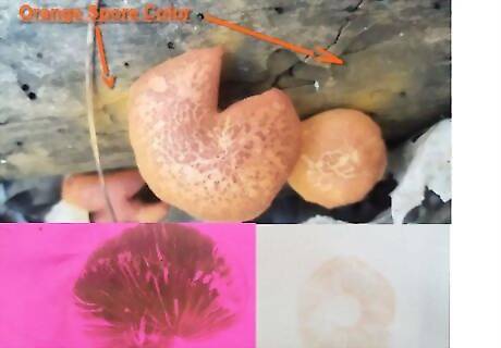 Take a spore print. Unless the spores are apparent on or around the mushroom, you will need a spore print to determine the color. To take a print, you will need a sharp knife, paper, and a container. Once you have properly taken a print, you can easily identify the color of the spores left behind. Make sure the mushroom in question is mature enough to deposit spores and not too old. Use a clean knife to separate the cap from the stem as precisely as possible. Place the cap, spore-side down, on paper. Cover with a container to limit airflow. Allow spores to settle on the paper for a few hours. If the mushroom is dried or drying out, place a slightly damp napkin on the cap; be sure not to wet the paper or the spores will be difficult to discern.