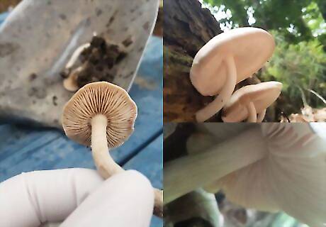 Check for any latex produced by the mushroom. Some mushrooms will bleed a milky substance known as latex. The entire genus Lactarius has this feature; they're commonly known as milk caps. The latex can be a variety of colors and may react with the skin or air changing colors. To determine if a mushroom will produce this substance: Make sure the mushroom is fresh enough to produce latex; often older specimens will dry out. Use a knife to make a small incision, either where the stem and gills meet or where the gills meet the cap. Watch for latex to ooze out. If it does, watch it continuously 3-5 minutes. Notice any color change. Then check back after 1 or 2 hours to see if any reaction has occurred. You will want to note the original latex and skin color, as a key feature can be the color reaction between them. For example, a mushroom with white latex and skin may later be stained purple from this contact.
