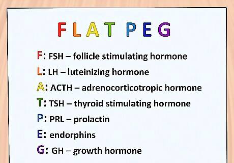 Use the mnemonic FLAT PEG to memorize the hormones of the pituitary gland. If you need to memorize the specific hormones secreted by a certain gland, an easy way to do this is with a mnemonic. Mnemonics are memory tricks that make it easier to remember a lot of information. To memorize the hormones that are secreted by the pituitary gland, use the phrase FLAT PEG: F: FSH – follicle stimulating hormone; stimulates ovary follicles to mature or testes to produce sperm L: LH – luteinizing hormone; LH surge triggers ovulation or stimulates testosterone production in the testes A: ACTH – adrenocorticotropic hormone; stimulates the adrenal cortex to release glucocorticoids and mineralocorticoids. T: TSH – thyroid stimulating hormone; triggers the thyroid to release thyroid hormones P: PRL – prolactin; triggers the breasts to produce milk E: endorphins G: GH – growth hormone; triggers growth of muscle and bone, and burns fat