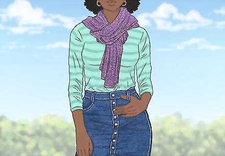 Wear a scarf. Thicker denim is often a staple of the colder months. A scarf can keep you warm and add a cute accessory to your look. You can pair a big, clunky scarf with a lighter top to balance things out. You can also pair a skinnier scarf with a heavy sweater. For example, wear a sweater with a denim skirt and wrap a thin, light scarf around your neck.