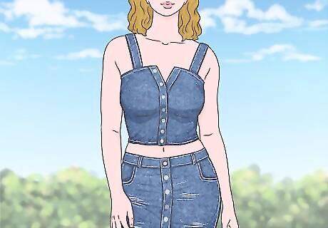 Try a denim top for a bold look. Denim on denim is noticeable. A denim top of a similar color to a denim skirt can make for a bold, if somewhat quirky outfit. This can be great for a night out if you're looking to get noticed. If you're doing a denim-on-denim look, remember your outfit itself should be the focus. Minimize makeup and accessories to highlight the look. Having the same type of wash makes for a fun, matching outfit. However, there are no strict rules. You can experiment with two different washes if you prefer.