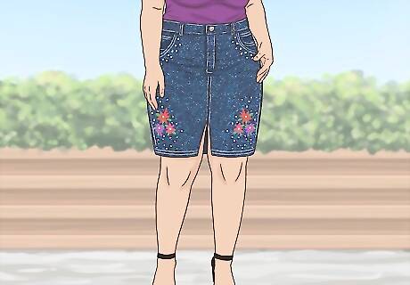 Try skirts with embellishments. If you want your skirt to be the central focus of your outfit, look for a skirt with a lot of embellishments on it. Denim skirts may have embroidered patterns, beads, frayed ends, or patterns like plaid. An embellished denim skirt can be great for a bolder look.