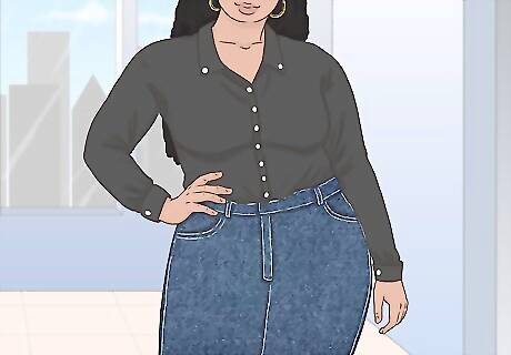 Wear a button-down blouse for a dressier occasion. Denim can be read as casual. If you want to add a formal flare when wearing denim somewhere like the office, pair a denim skirt with a button-down shirt. A classic button-down shirt, especially one worn with a longer denim skirt, can really give off a formal vibe. For example, pair a black button-down shirt with a denim pencil skirt for a cute office look. For very formal occasions, it may be a good idea to tuck in your blouse.