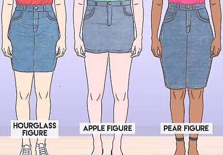 Determine your cut based on body type. Denim skirts come in a variety of sizes, so choose a cut that's flattering to your body type. Different cuts look better on different builds. While you can experiment at home or in the store, here are a few rules of thumb to help: Form-fitted skirts work great if you have a slender figure or hourglass figure. A high-waisted, shorter skirt looks great for an apple figure. If you have a pear figure, go for an a-line skirt.