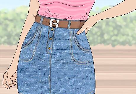 Cinch your skirt with a belt. If you want to use denim to highlight your figure, cinch your denim at the waist with a belt. This can be especially great if you're wearing a high-waisted denim skirt with your shirt tucked in. Any variety of belts work, but a thicker belt is more attention-grabbing. If you want to call a lot of attention to your waist, go for a big, thick belt.