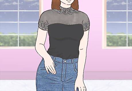 Tuck a t-shirt into your skirt to highlight your frame. If you want something casual, but form-fitted, wear a simple t-shirt with a high-waisted denim skirt. Tuck the shirt in to highlight your waste for a cute denim look. This look works for a variety of occasions. Graphic t-shirts can look great for a casual look, while form-fitted tees can give off a classic, semi-casual look.