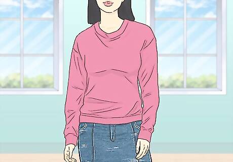 Try an oversized sweater for something casual and cozy. To give off the casual and cozy vibe, pair a denim skirt with a big, oversized sweater. This makes for a cute look that also keeps you warm. A sweater can be paired with a longer skirt, especially on a colder day when you may want more coverage. However, you can also create some variety with texture by pairing a short, lighter denim skirt with a big sweater.
