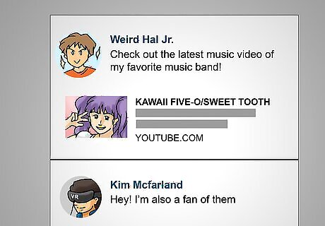 Show the group to your friends in an online chat. Word of mouth is one of the best ways to expand the listening base of a band. Send friends a song or two from the artist you really enjoy in a message. Link YouTube videos and your friends for their feedback. Start a group on Facebook with friends and build a community where you can share new music that you find.