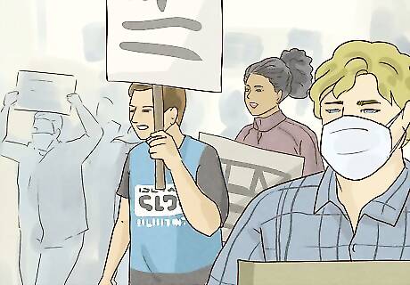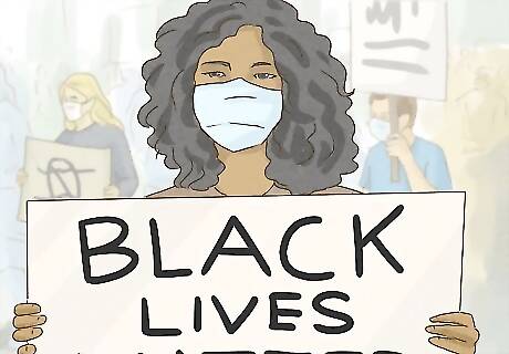 Participate in BLM protests to show solidarity and raise awareness. Peaceful protests are a fundamental human right, and they’re also a powerful way to highlight the cause. Check with local organizations that support the Black Lives Matter movement to find out about upcoming events near you. You can also find local protests by following activist organizations on social media. Going to a protest can be risky. Be prepared and take basic safety precautions, like wearing sensible clothes and protective gear (such as shatter-proof goggles), bringing a list of emergency contact numbers, and steering clear of fights or looting. If the coronavirus is still active in your area, wear a mask and bring hand sanitizer to help protect yourself and others. There’s a chance you could get arrested, even if you’re protesting peacefully. Research protestors’ rights in your country ahead of time so that you know what to do if this happens.