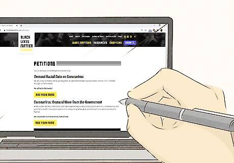 Sign and share petitions that support BLM causes. Petitions help the people in power recognize the need for change. Signing a petition and sharing it is also a great way to set a good example for others! Look for petitions online that promote BLM and related causes. When you sign a petition, share it on social media or forward it on to your friends and family so that they can sign it, too. You can find multiple petitions related to the BLM cause on Change.org: https://www.change.org/t/black-lives-matter-en-us. The official Black Lives Matter website also features a variety of petitions that you can sign and share.