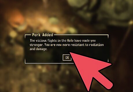 Go into the arena. If you've managed to find any Rad-X, take it immediately. Stay back as far as you can; the radiation affects you immediately. If you found RadAway, do not take it immediately, as it only works for curing existing radiation poisoning. Wait until later in the fight.