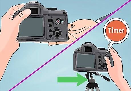 Ask a friend to take the shots or practice using your camera’s timer function. Since you’ll want to take as many different and varied photographs as possible, it’s probably easiest to ask someone not posing in the photo to snap the shots. If there’s no one available, though, make sure you familiarize yourself with your camera’s timer function or remote control. Practice taking shots of yourself and others using these functions, then review the results to make sure you’ve got the knack. You can improvise with setting your camera on any available flat surface and adjusting the height, but it’s probably easiest and most dependable to purchase or borrow a tripod.