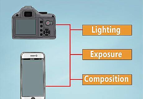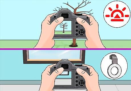 Shoot in the early morning or late afternoon. Lighting is one of the most important conditions determining photo quality, so pay attention to the time of day and the devices you’re using. If you’re using natural light, shoot in the morning or evening when the sun is on the horizon, as these are the times when light is most dramatic and provides the sharpest contrasts. If you’re photographing indoors, try to shoot in plenty of natural light, or use a ring flash to create effective, rich contrast and shadows. Unless you’re using a fancy, pro-grade camera, try to avoid using the flash. A basic flash shoots parallel to the camera lens, creating flat, washed-out photos with no background.