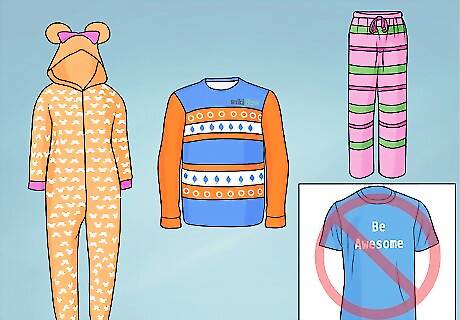 Decide what kind of clothing or costumes you want. Your grandparents’ family portraits probably stipulated that everyone wear matching black sweaters or all-white ensembles, but contemporary photography demands no such uniform. Just make sure you’ve planned it ahead of time so that everyone knows what they need to show up wearing on the day of the photo shoot. Depending on what kind of theme and tone you’re going for, you can all wear uncoordinated, everyday clothing, themed sweaters, cozy pajamas, or even goofy matching onesies. Many photographers will advise their subjects not to wear anything too distracting—for example a loud print or something with a lot of text on it—so keep this rule of thumb in mind if you’re leaning toward letting everyone pick their own ensemble.