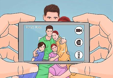 Experiment with different poses and expressions. Traditional family portraits generally demand that everyone line up looking toward the camera with grins frozen on their faces. There’s nothing wrong with this kind of photo necessarily, but taking lots of photos throughout the shoot—including ones with candid conversations, laughing, and turned heads—is more likely to capture your family’s natural and unique dynamic. If you’re using a cell phone camera and it has a burst function, use it! The rapid-fire sequence of shots will be more likely to capture a moment when no one is blinking or making an awkward face. While you shouldn’t discourage movement and natural gestures, aim to keep everyone grouped closely together in order to avoid uneven gaps in your composition.