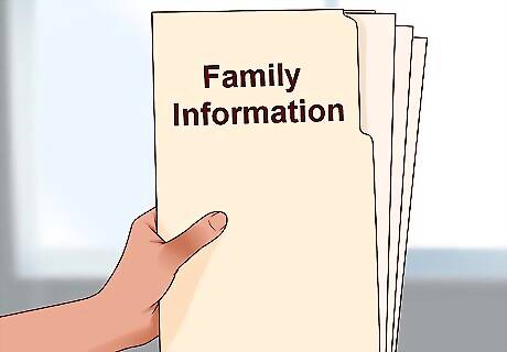 Search persistently. You may be able to get some information easily through what you know about your family or simply by asking. However, for relatives that are deceased or with whom you may not have contact, this can be more difficult. Depending upon your situation, sources of information may include: Family records including family trees, genealogies, baby books, letters, or electronic health records. Public records such as birth certificates, marriage licenses, death certificates, obituaries, records from religious institutions. Newspapers and government offices often contain birth, death and marriage announcements. Your adoption agency. If you were adopted, the agency that managed your adoption may have either provided medical information to your adoptive parents or may keep it on file. You can also contact the National Adoption Clearinghouse or go to www.childwelfare.gov Your sperm/egg bank. If you were conceived with donated sperm or eggs, the bank likely has medical records that they collected while screening the donors. This information is often provided to the parents and children. You can also search for donor sibling registries online to determine whether you may have half siblings via the same donor who might have developed health conditions.