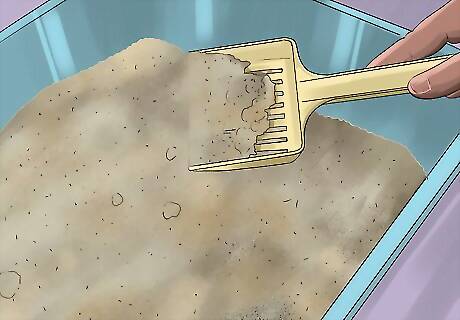 Clean the cat's litter box regularly. In order to keep your cat happy you will need to give it a clean and accessible place to go to the bathroom. Place the litter box in a location that the cat can easily get to and give it a scoop daily. Replace the litter completely every week or two, depending on how dirty it gets. Use a type of litter box and litter that the cat likes. If the cat is refusing to use its litter box, try replacing the type of litter you are using first. If that doesn't work, get a box that is shaped differently. Some experts suggest having one more litter box than you have cats. This means that if you only have one cat, try to keep two litter boxes. Spread them out across rooms and levels of your home so that your cat has a place nearby whenever they need to relive themselves.