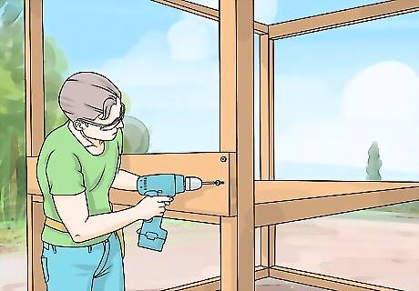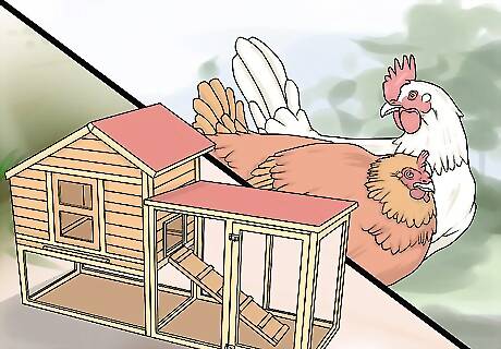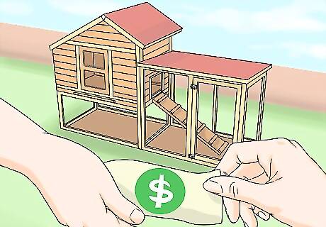 Try your hand at building a coop instead of buying one. If you have some knowledge in building things, you should be able to construct your own chicken coop. You can get many coop designs online, or design your own coop. Whether your buy or build, place the coop in an area with plenty of grass and some dirt patches. Chickens like to eat any grass they come across, and they love to dust bathe daily. Consider attaching a run to the coop so that your chickens can roam around outside, but still be protected from predators. If you cannot buy or build a coop, you can instead keep your chickens in a warm, well ventilated, predator-proof shed.