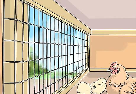 Make sure the chickens’ enclosure is safe from predators. Chickens have many predators, including raccoons, cats, and dogs, all of which can fit through cracks in the coop or fence, or dig under the coop or fence. Make sure to reinforce your chickens’ enclosure, or you may find all your chickens gone in the morning. Put up a fence around the chickens’ enclosure. Make sure the fence is made out of strong materials. Bury the fencing into the ground so predators cannot dig underneath the coop and get in. Block off any gaps that predators can fit through in the fence or coop. You can block off the gaps with a piece of wood, tile or something similar.