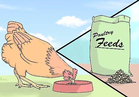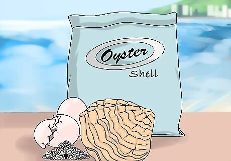 Supplement your chickens’ diet with high-calcium grit. Provide grit to help your chickens grind down their food and provide calcium for laying hens. Crushed oyster shells or egg shells are a great source of calcium. Free-range chickens may not need to be supplied with as much grit, as they find things in the ground to replace it. Many chicken feeds already contain calcium-rich grit. If not, you can buy it separately at the feed store and add it (according to the ratio provided on the package) to the feed. Additionally, you should let your chickens free-feed on insoluble granite grit 2-3 times per month. You can buy this at the feed store as well.
