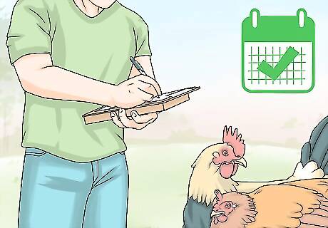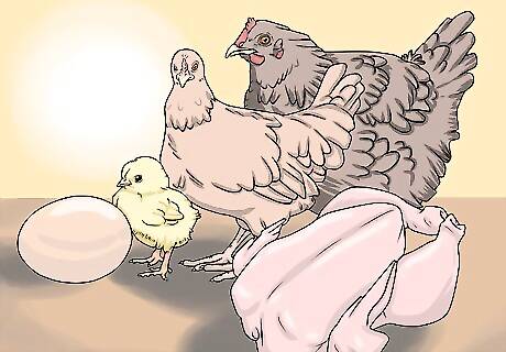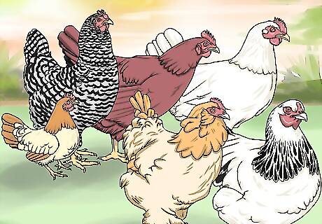Choose chicken breeds that suit your purposes. Some breeds are better egg-layers than others and tend to lay eggs longer. Others are best used as broiler (meat) chickens because they mature more quickly. You can also get more unique and colorful chickens, which can be kept for show, or bantams, which can be kept as pets. If you’re looking for good egg-layers, consider the Plymouth Rock, Rhode Island Red, or Leghorn breeds. These chickens tend to lay more eggs for a longer period of time. If you’re looking for chickens to use for meat, consider keeping Faverolles or Brahma chickens. If you’re looking for show breeds, research different kinds of breeds online. Generally, a show breed can be any chicken that looks particularly colorful and unique. If you’d like a simple pet chicken, consider bantam-sized chickens, which are smaller and often friendlier than the standard chicken.