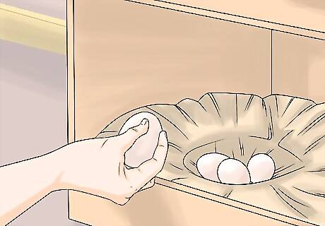 Collect the chickens’ eggs each day. Happy hens will, on average, lay 1 egg apiece every day. You should collect the eggs every morning or afternoon to make sure you are receiving a fresh supply. During the heat of summer, you should collect the eggs twice a day. You should collect the eggs in a basket, box or some sort of container. If you drop an egg, make sure to clean up the mess!