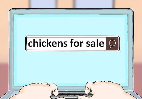 Locate sources for acquiring chickens in your area. You can browse on websites that sell chickens, such as Craigslist, or you can look on bulletin boards at pet shops to see if there’s an advertisement for chickens there. You can also try asking a local farmer if they’re interested in selling a few chicks or pullets. Young chicks can also sometimes be purchased at local feed stores, or you can purchase some fertilised eggs online and get them mailed to you. Chicks are usually available in spring or summer, so if it’s winter or autumn, you might want to get some pullets instead.