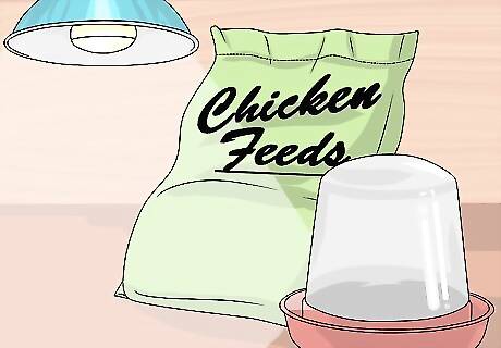 Acquire the necessary equipment to care for chickens. When caring for chickens, you’ll need to have the right feeding equipment, bedding supplies, and extra items to go in their coop. Purchase feed and water containers. You can use tubs or bowls as your chickens’ feed and water containers, or you can buy or make a feeder and drinker. If you’re planning on breeding your chickens, you’ll want to keep a drinker since it will lessen the chance of chicks drowning. Stock up on extra bedding. You can never have enough extra bedding material, since you will be disposing of the used bedding every time you clean the coop. Get a heat lamp if necessary. If you plan on breeding your hens or if it gets quite cold during winter in your area, you’ll have to invest in a heat lamp to keep your chicks and chickens warm.