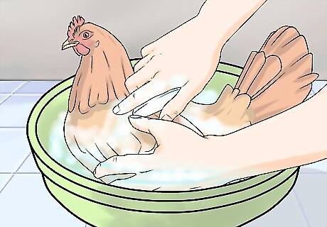 Bathe your chickens if necessary. If you’re preparing your chickens for a show, or if they’re just very dirty at the time, consider bathing them. While you’re at it, clean the coop as well! Grab a big enough tub, a mild soap, and a cup or sponge. While you're bathing them you might also trim their beaks and nails, and clip their wings too.