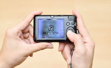 Set up your camera. You may want to try several poses to find the most flattering one. If you have a timer, and a series option, you can set your camera to take several pictures at a time, which gives you time to pose or smile. You may look more together if you're not worried about operating the camera and posing. Give yourself more than enough time with the timer so you don't have to run back and forth too quickly. If you love the timer method, invest in a remote.