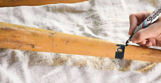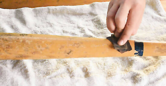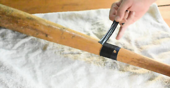 Remove any residue, if necessary. Use a piece of fine-grit sandpaper to get rid of any remaining tape residue if you are using a wooden bat. Try to remove as little wood as possible and make sure your sandpapering is even. Use a specialized residue remover like Goo Gone or CleanUp Batter if you are using an aluminum bat. Both solvents can be used by pouring a small amount onto a rag and rubbing the area of your bat where you want to remove residue. You can wear latex gloves for this step if you like.