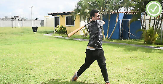 Get into proper batting stance. Step outside and find some space to swing your bat. Go to your local ballpark or use a makeshift home plate if you can’t get there. Get into proper batting stance: Stand with your body perpendicular to the plate. Place the bat over your shoulder, keeping it pointed up. Make sure your feet remain shoulder width apart. Keep your hips, knees and shoulders square to the plate. Slightly bend your knees.