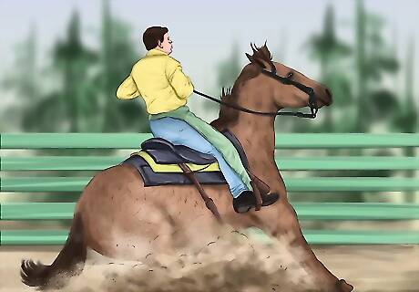 Have the horse stop. To complete a full sliding stop, the horse should round its back and lower its hindquarters toward the ground, while the front legs stay loose and in motion.