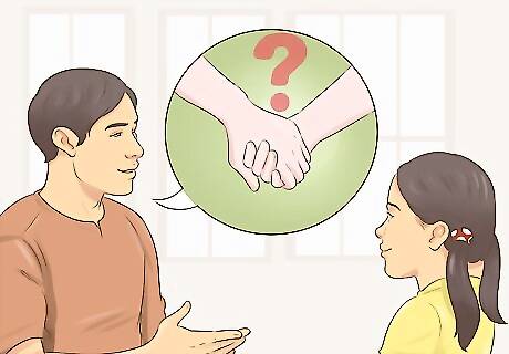 Demonstrate consent when you are around other adults. As a parent, you should get in the habit of demonstrating consent in front of your child when you are around other adults. This means asking a person you just met, “Can I give you a hug?” before you hug them in front of your child. Model consent for your child so they know how to do it themselves. You should also be willing to stop a behavior if the person is uncomfortable. For example, if a family member you are tickling says “stop” or “no,” you should stop tickling them.