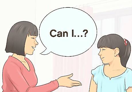 Explain how to ask for consent. Start by sitting your kids down and explaining the importance of asking for consent before you do something to another person. Tell your child that it is important to ask the person, “Can I…?” or “May I…?” Then, they should wait for the person to say “Yes” before they act. This can help them understand that consent is essential when interacting with others. For example, you may say to your child, “What do you say before you touch someone’s arm at school?” They should then respond, “Can I touch your arm?” You may then reply, “That’s right, and what do you have to hear before you can touch their arm?” Your child should then respond, “Yes. They have to say yes before we can touch them.” You can also establish the rule of consent for things other than touching, as this will help to reinforce the importance of asking for permission before doing anything to anyone. For example, you may say, “What do you say when you want to play with your sister’s toy?” Your child should then say, “May I play with the toy?” For children between 1-5 years old, you should focus more on asking for permission, helping others, and saying "No." For children between 5-12 years old, you should focus more on teaching kids to respect one another’s space and to avoid bullying behavior to help grow empathy. For teens and young adults, the focus should be more on sex, self-esteem, and setting healthy boundaries.