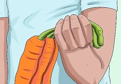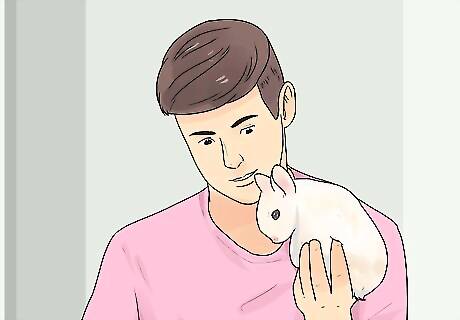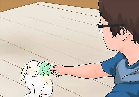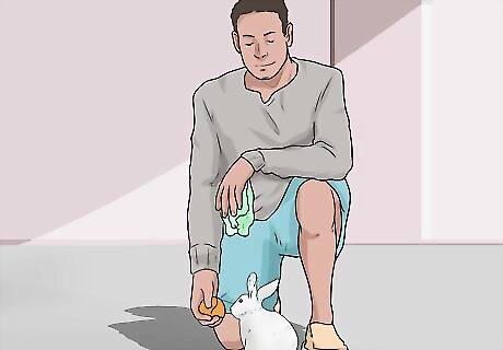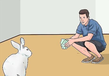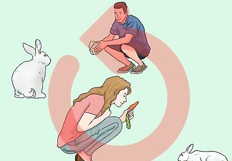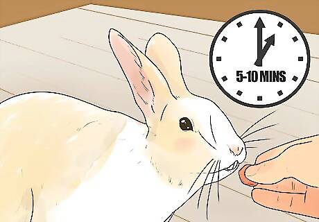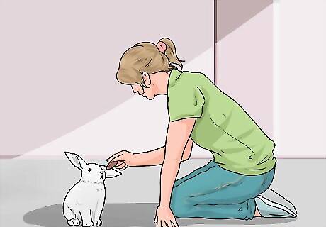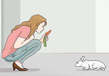 Sit on the floor near your rabbit. Bring healthy rabbit treats, such as carrots and celery. Hold out the treat and say "[your Rabbit’s name], come.”