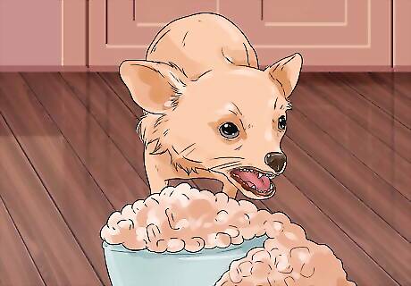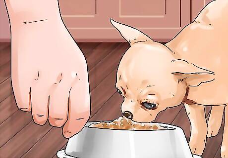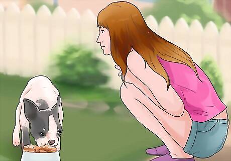 Pet the dog as it eats. Slowly move toward the dog and begin to pet his back. Stop if the dog shows signs of aggression and give him time to relax. When he accepts your hand, praise the dog and give him another treat. Repeat this each mealtime, gradually moving on to petting his head and playing with his ears. If your dog has anything more than mild food aggression, avoid going near it while it eats and work with a professional instead.