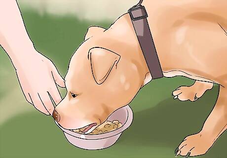 Feed the dog alone and at set mealtimes. Start feeding the dog in a room by itself, away from all other people and pets. Give it a bowl of food two or three times a day only. When each meal is over, remove the bowl and place it out of sight.