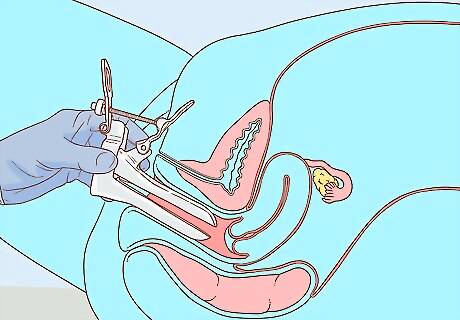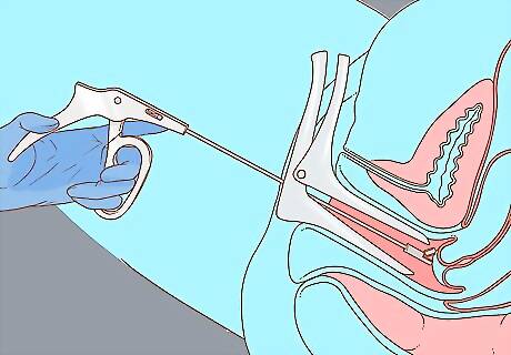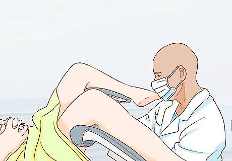 Get undressed when the nurse asks you to. When getting this exam done, you'll likely be asked to undress and put on a gown. Then, you'll get up on the exam table and put your feet in stirrups so the doctor can examine you. This test is typically administered by family medicine physicians or gynecologists with the help of an assistant. Usually, the staff will leave the room while you get undressed.
