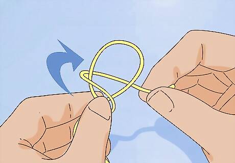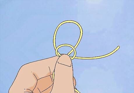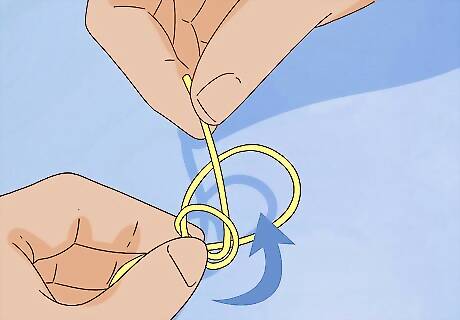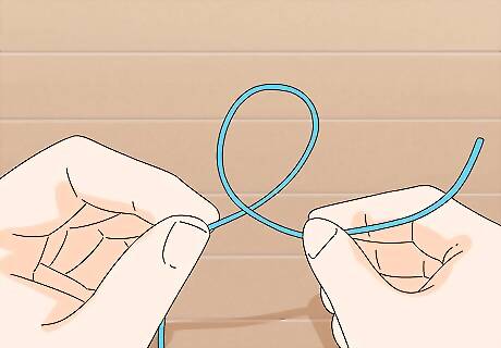 Start your first loop by curling the working end underneath the standing part. Take the tag end of your working end and curl it into a small circle by wrapping it perpendicularly around the left side of the standing part. Make sure that the tag end is now underneath the standing part. The open space inside of your loop shouldn't be more than a few inches, but it should be big enough that you could fit another loop of the same size through it. A loop where the standing part is on top of the working end is called an underhand loop. If your loop looks like an upside-down teardrop, you’ve done it correctly!